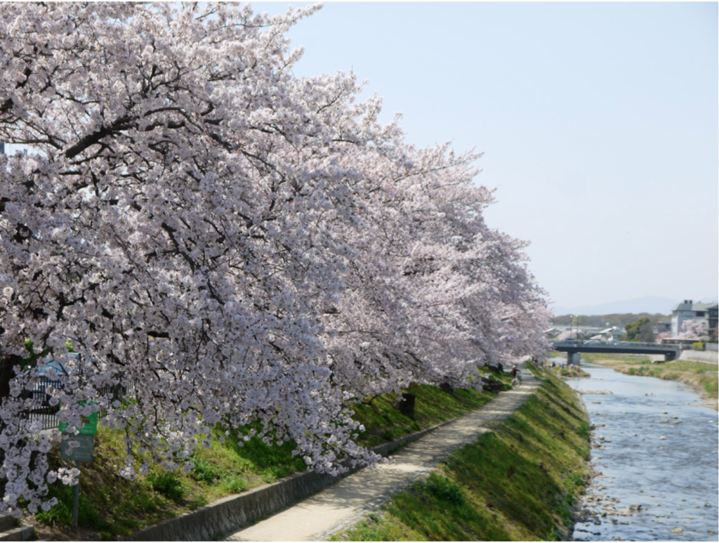 京都市左京区を流れる高野川は、春になると両岸に咲き誇る桜並木が訪れる人々を魅了します。特に叡山電鉄「出町柳駅」から北へ歩く高野川周辺は、ローカルな雰囲気が漂い、桜のトンネルのような景色が続きます。